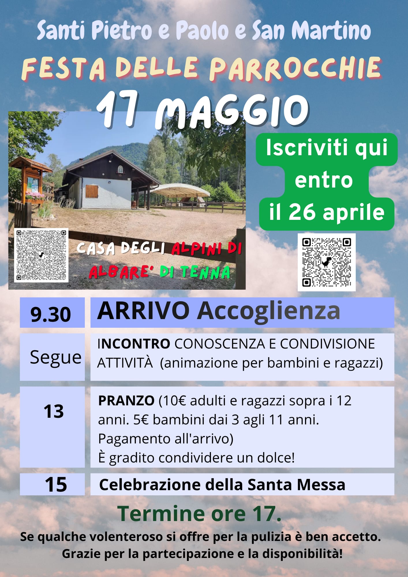 FESTA DELLE PARROCCHIE 17 MAGGIO 2026 Pubblicato il 19 Aprile 2026 Il 17 maggio Siete tutti invitati alla festa delle parrocchie! Sarà un bel momento per conoscerci meglio, condividere le esperienze dell’anno e, perché no, mangiare insieme! 🙂 Vi chiediamo di compilare l’iscrizione entro il 26 aprile tramite questo link https://docs.google.com/forms/d/e/1FAIpQLSeYWs3wg-Gbr5ZbOVAU3eY3a5lbw3AZcHCo_6qd4gchwe8FVw/viewform Il contributo per il pranzo verrà raccolto all’arrivo, domenica.